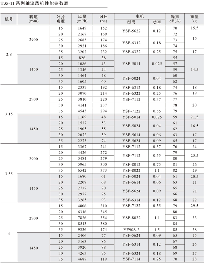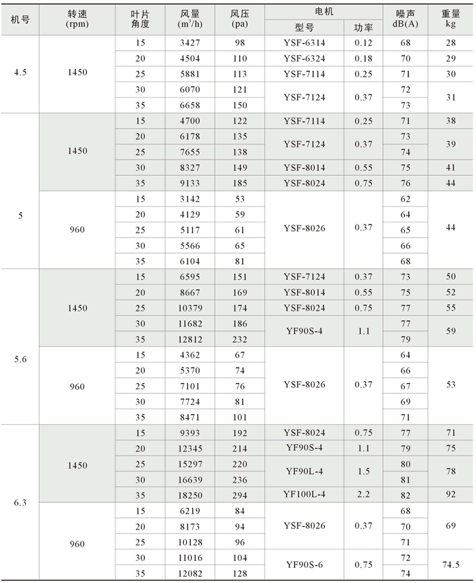 本系列风机叶轮直径由小到大共有十三个规格,每一规格风机的叶片数都为4片。