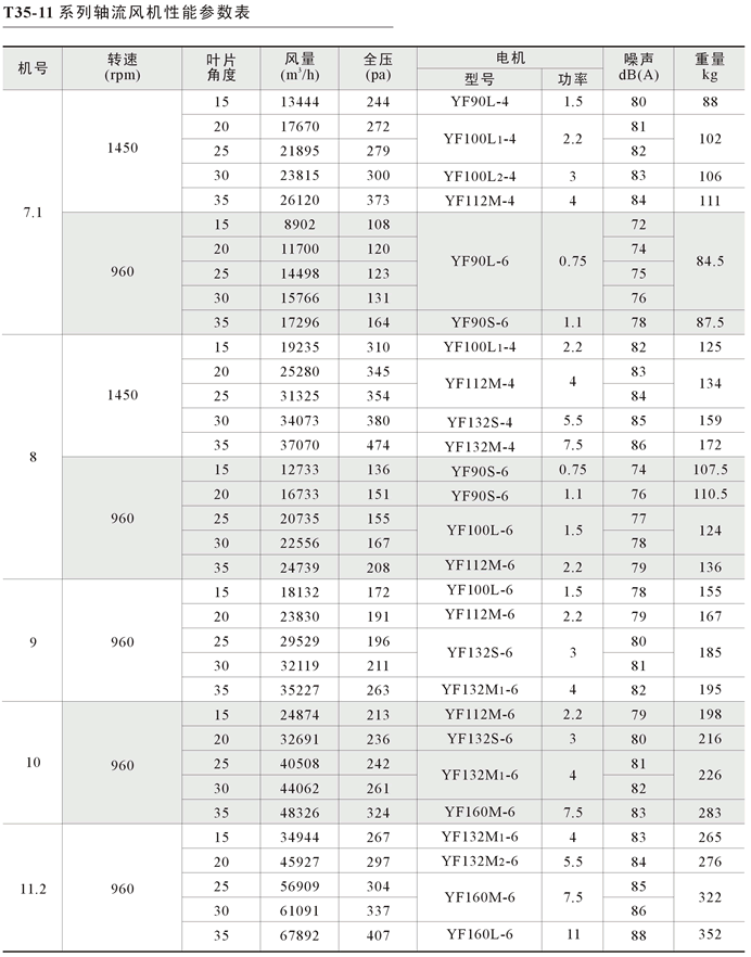 | T35-11系列轴流风机是我国八十年代在30-11的基础上改进设计的新型风机,它与30-11风机相比具有明显优点:①结构更合理:轮毂圆筒形,减少流动损失,叶片根部强度高;②性能有较大的提高;全压效率为89.5%,噪声(比A声级)降低3.6dB(A)。