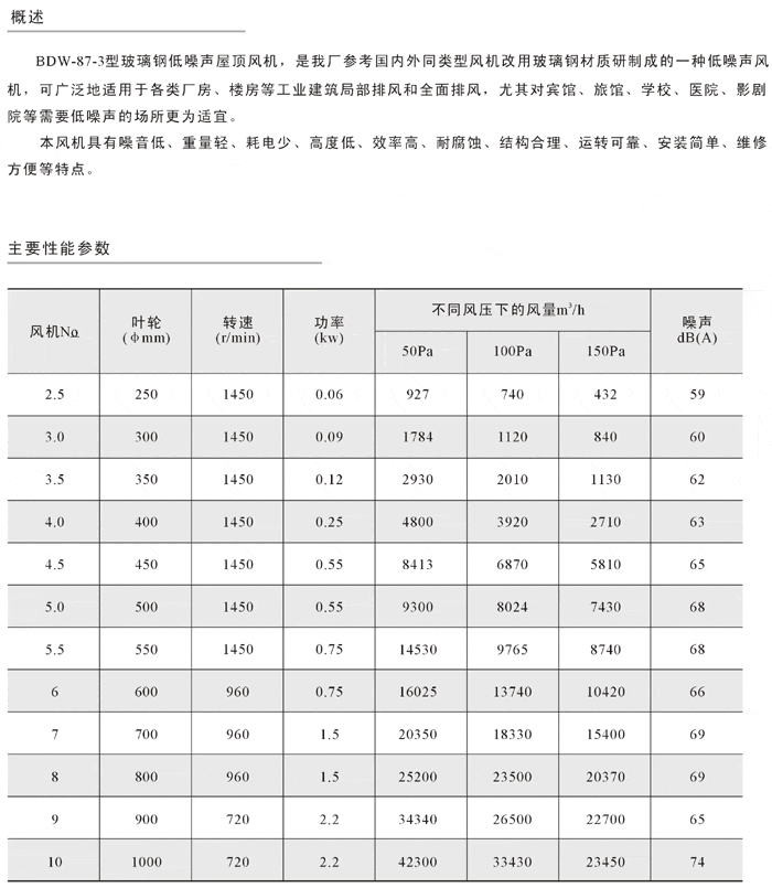 产品名称:BDW-87-3型玻璃钢低噪声屋顶轴流风机